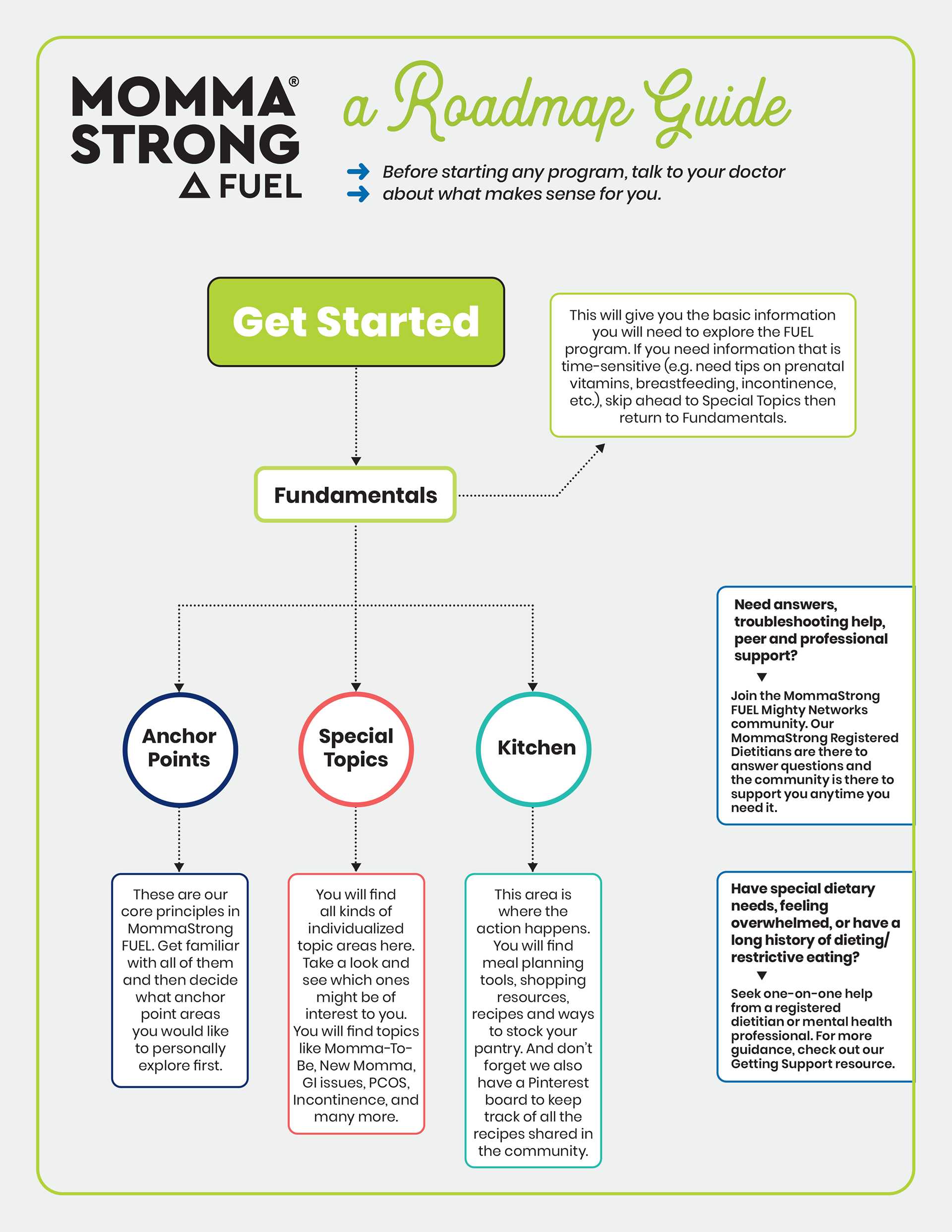 I designed this roadmap to display on the MommaStrong website as a reference guide to new and existing members. Because the fitness program was targeted to mothers, their needs changed often, as members move in and out of pregnancy and postpartum periods.